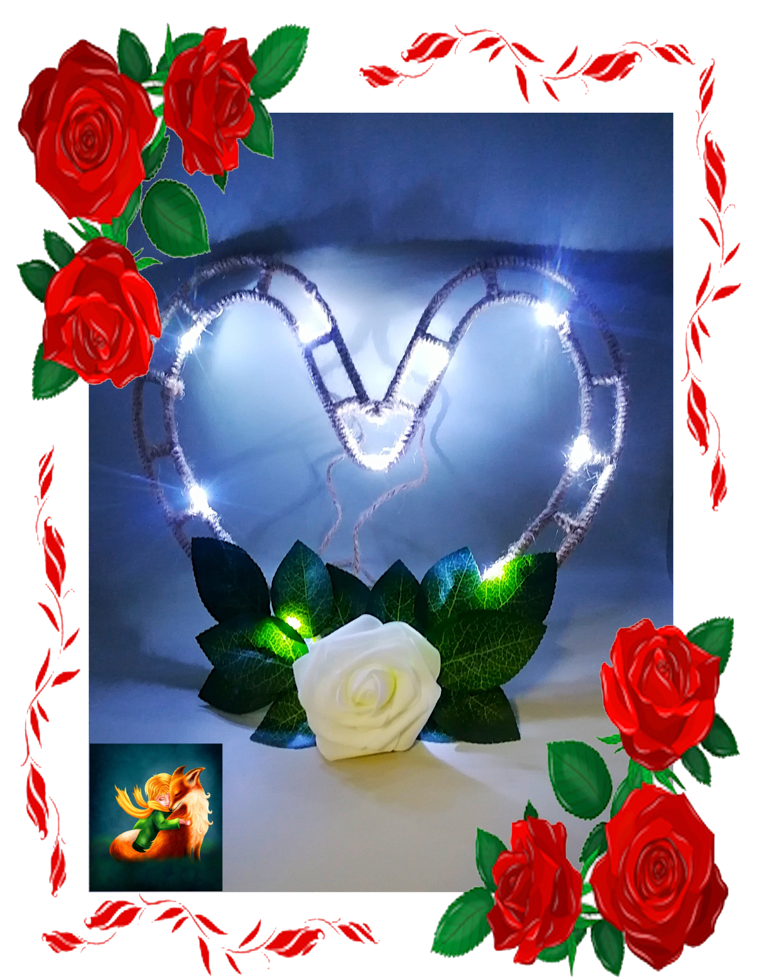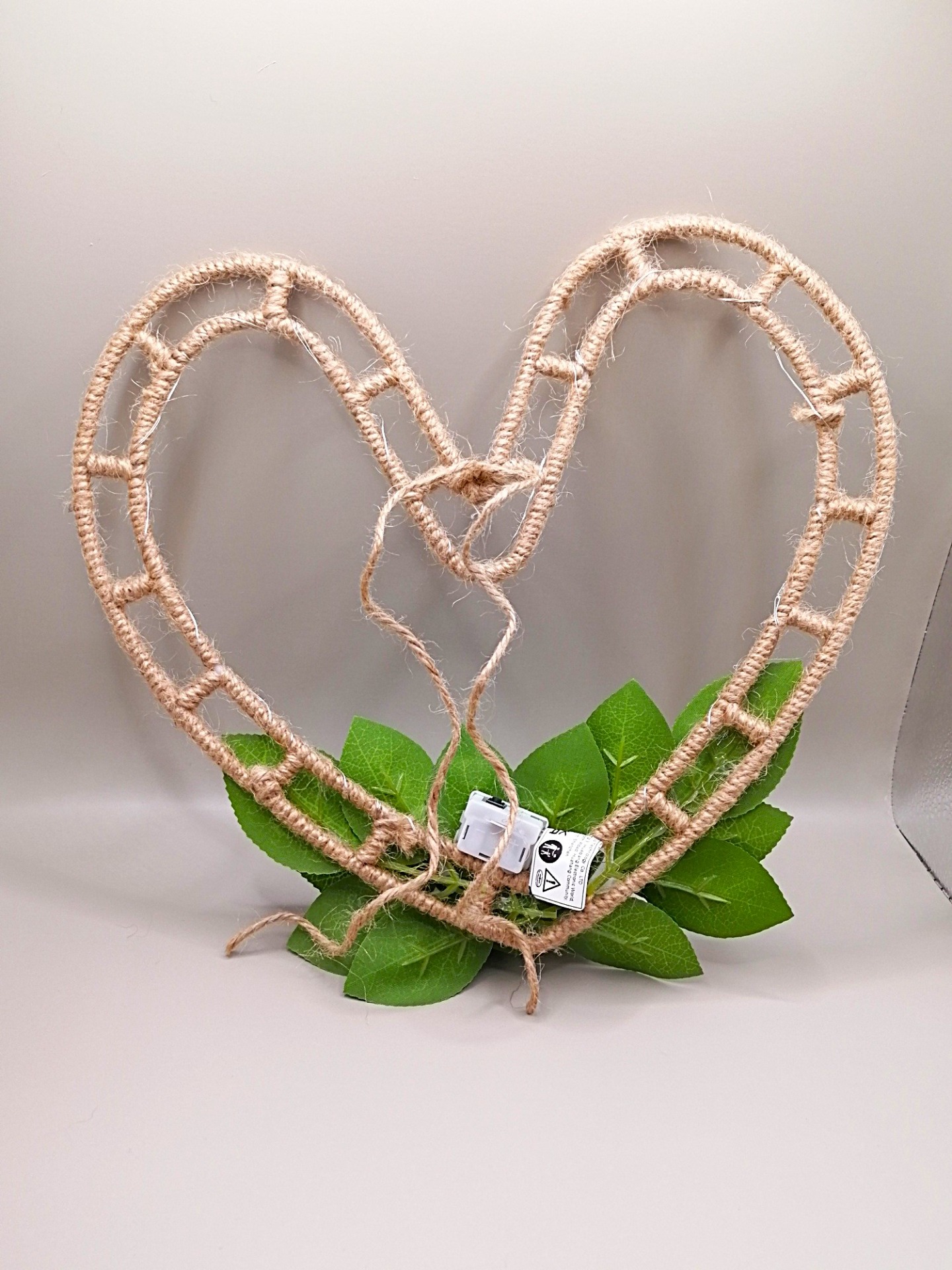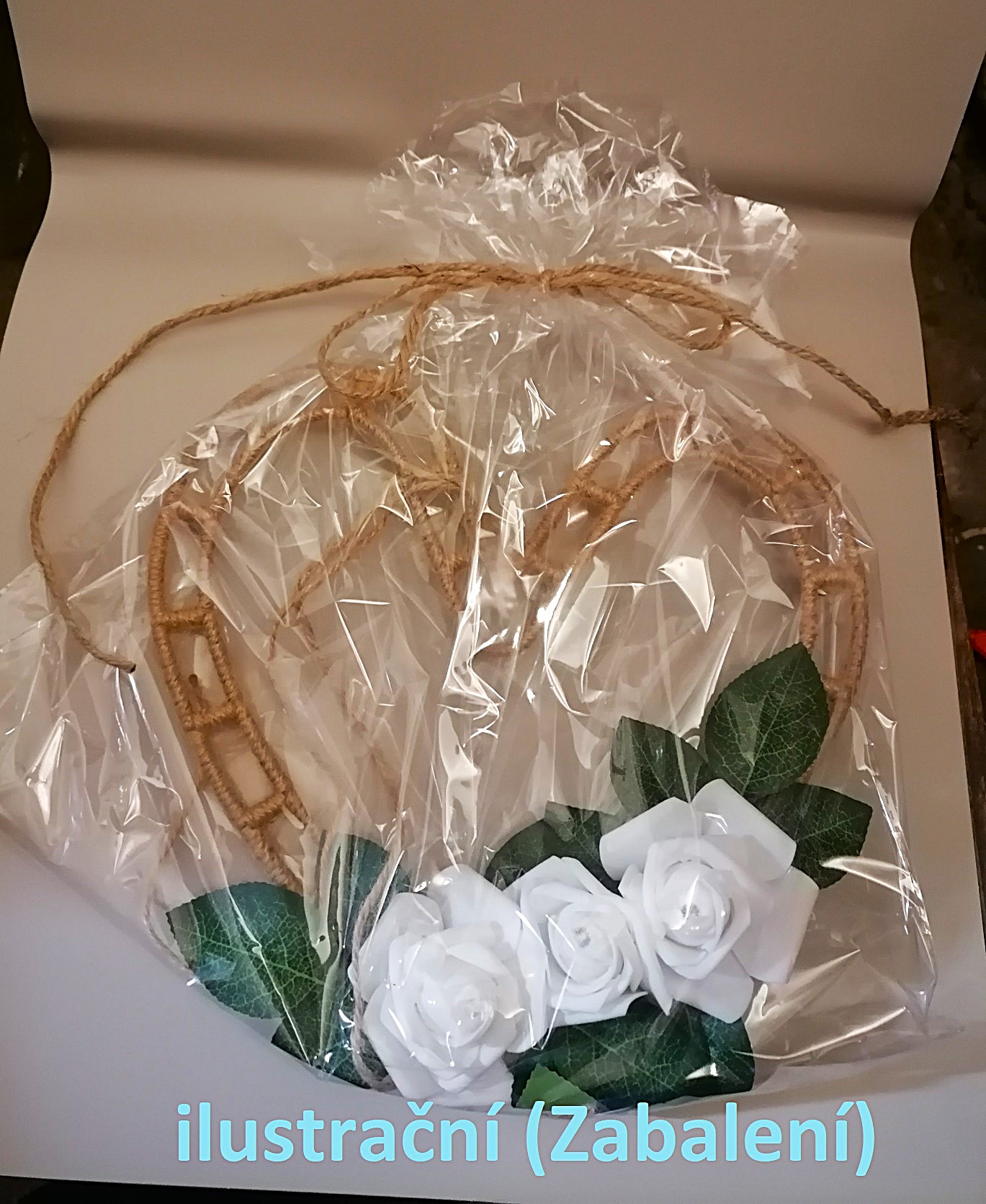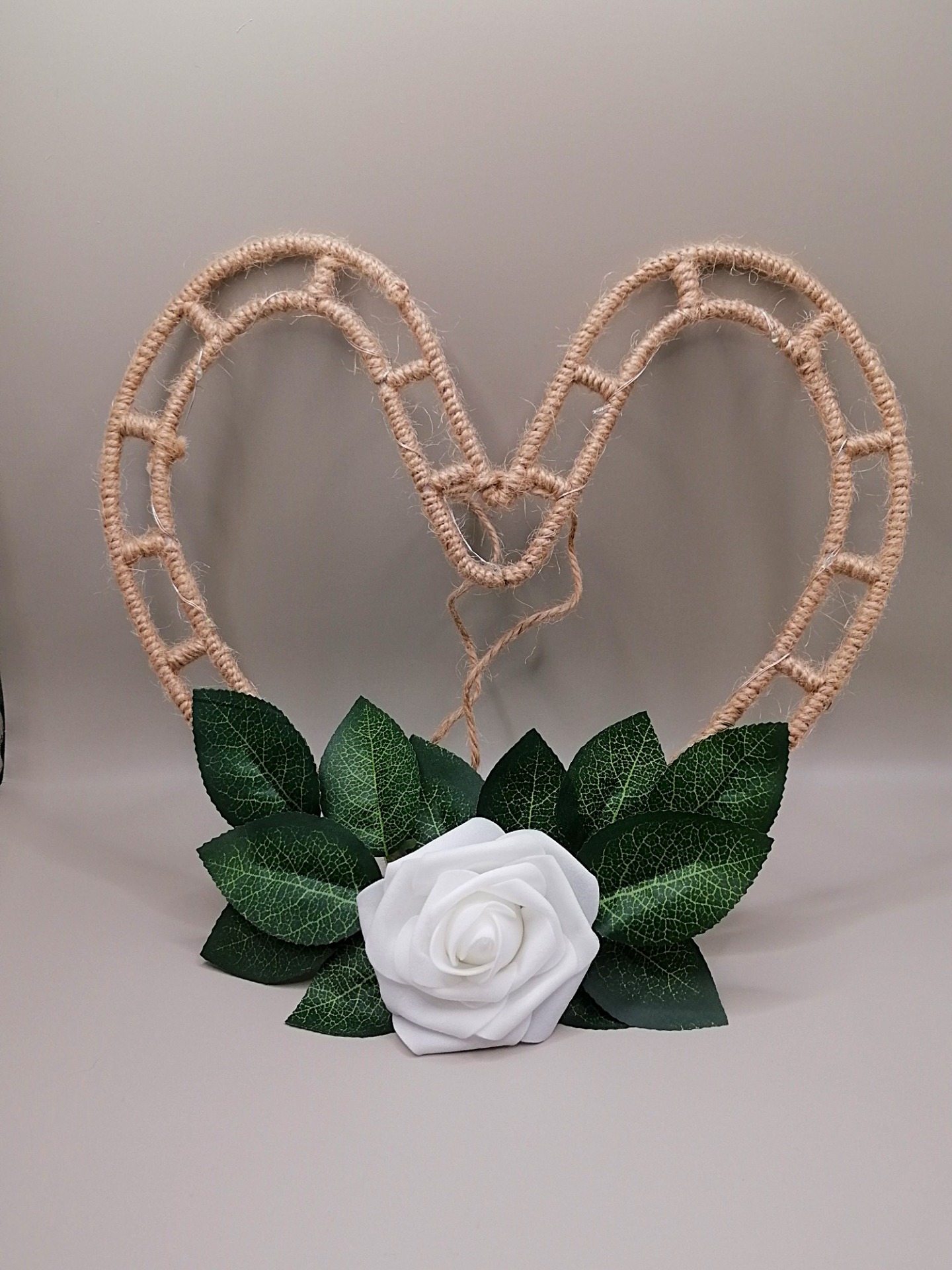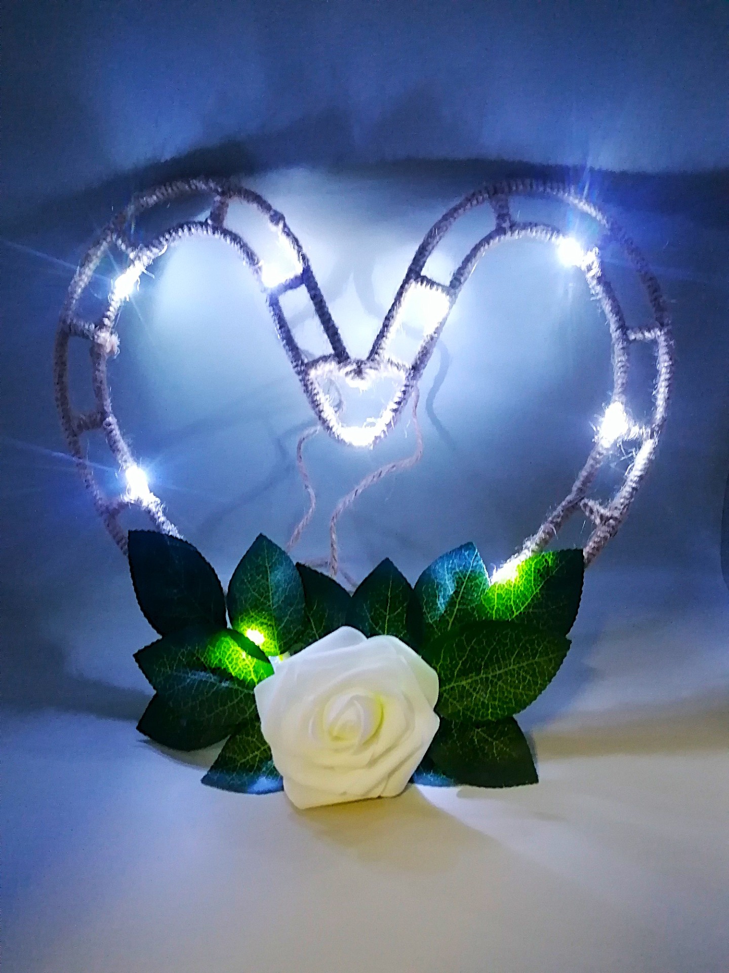 Ručně vyrobené srdce z pěnových růží v krásné bílé barvě s umělými listy a jurtou.Pěnové růžičky i listy jsou přilepené - je tedy bitelné. Provázek z druhé strany umožňuje zavěšení například na zeď.Velikost: 20 cmSvětýlka: ANO