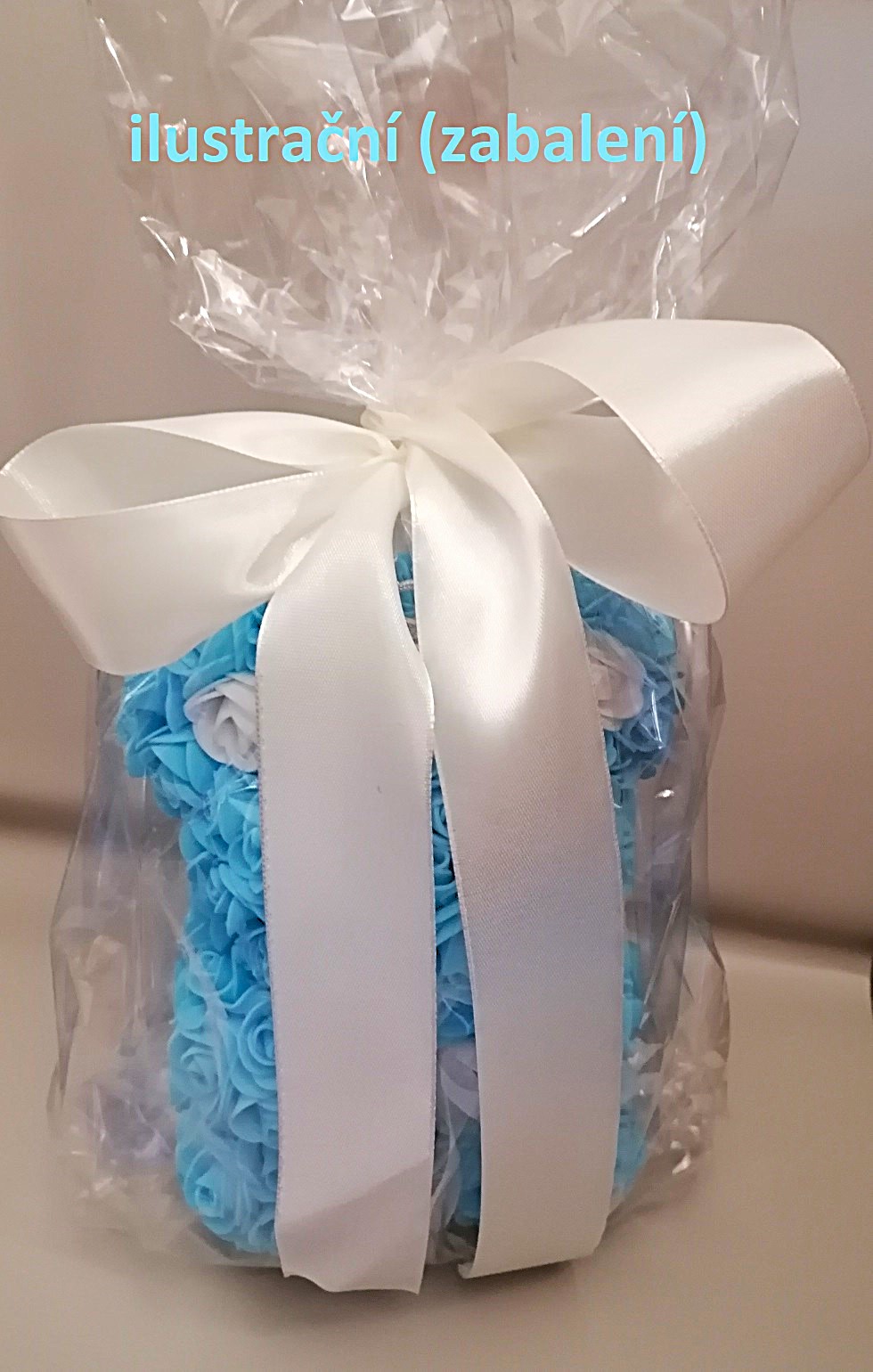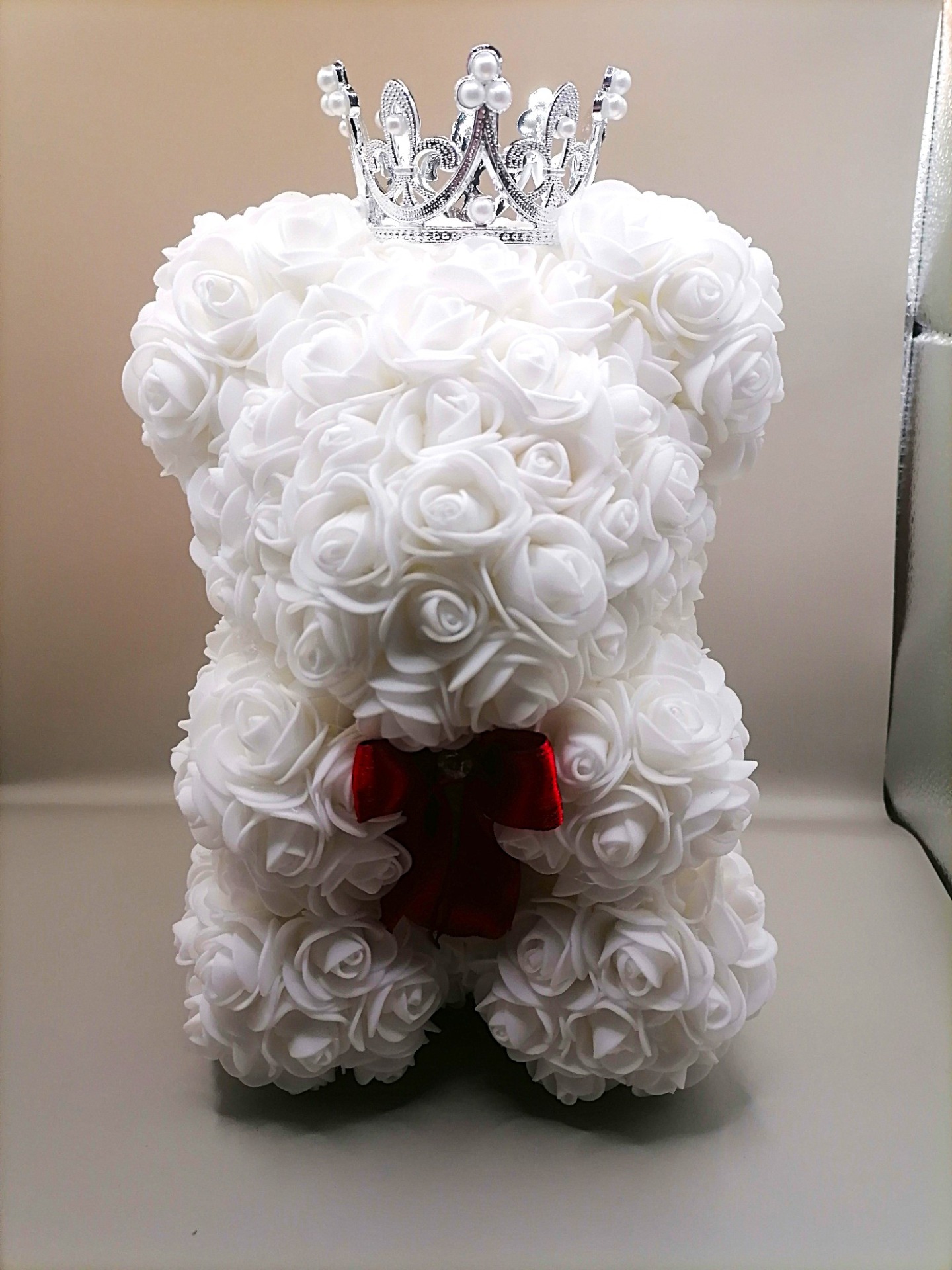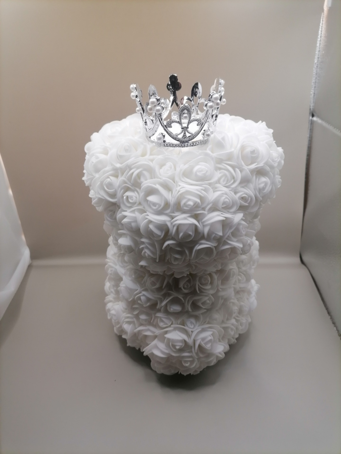 Ručně vyrobený medvídek z pěnových růží v krásné bílé barvě.Pěnové růžičky i korunka jsou přilepené - je tedy bitelný. Růžičky jsou natěsnané hustě, tedy nabízí vyšší kvalitu, než medvídci nabízené u jiných prodejců.Velikost: 24 cmSvětýlka: NE