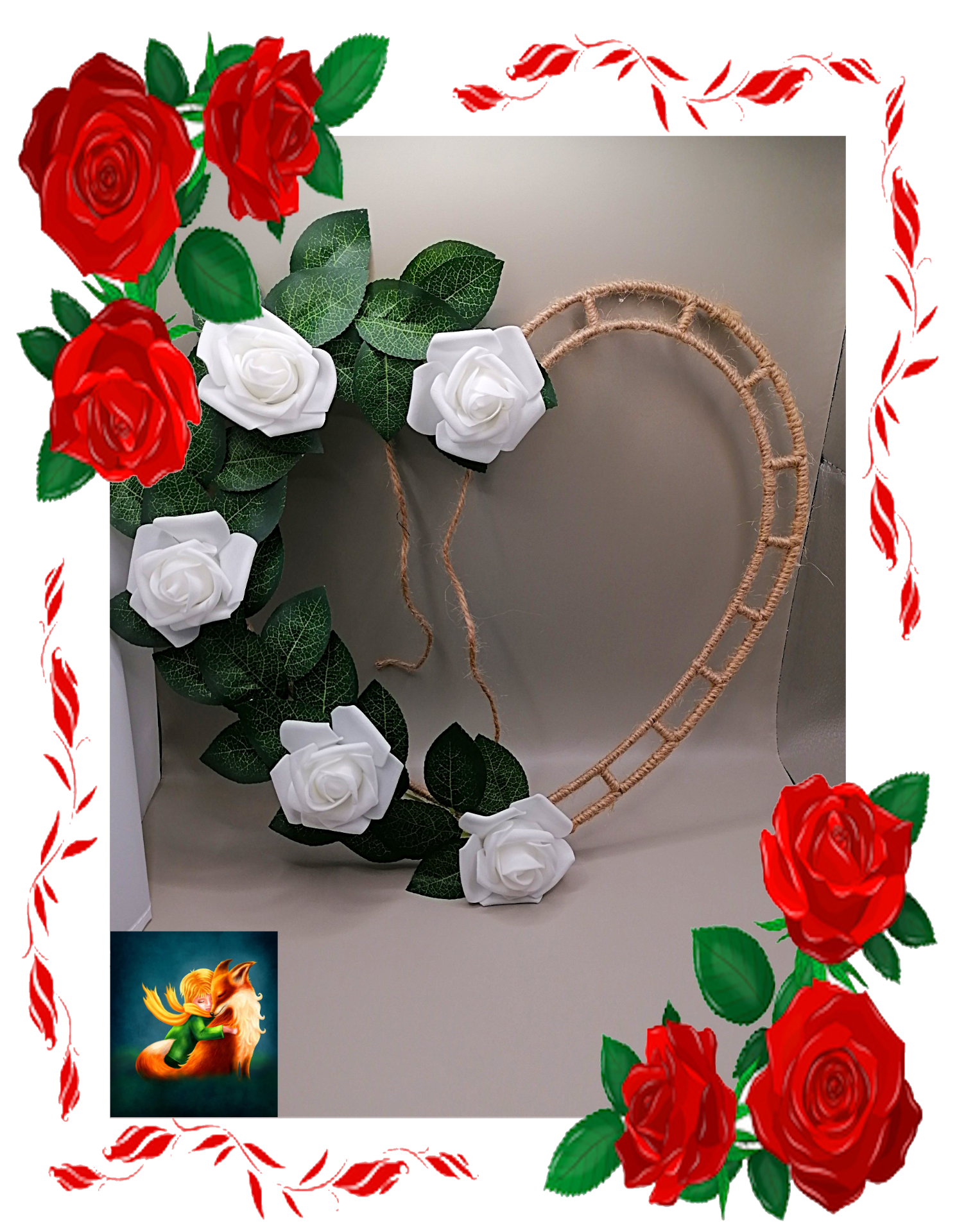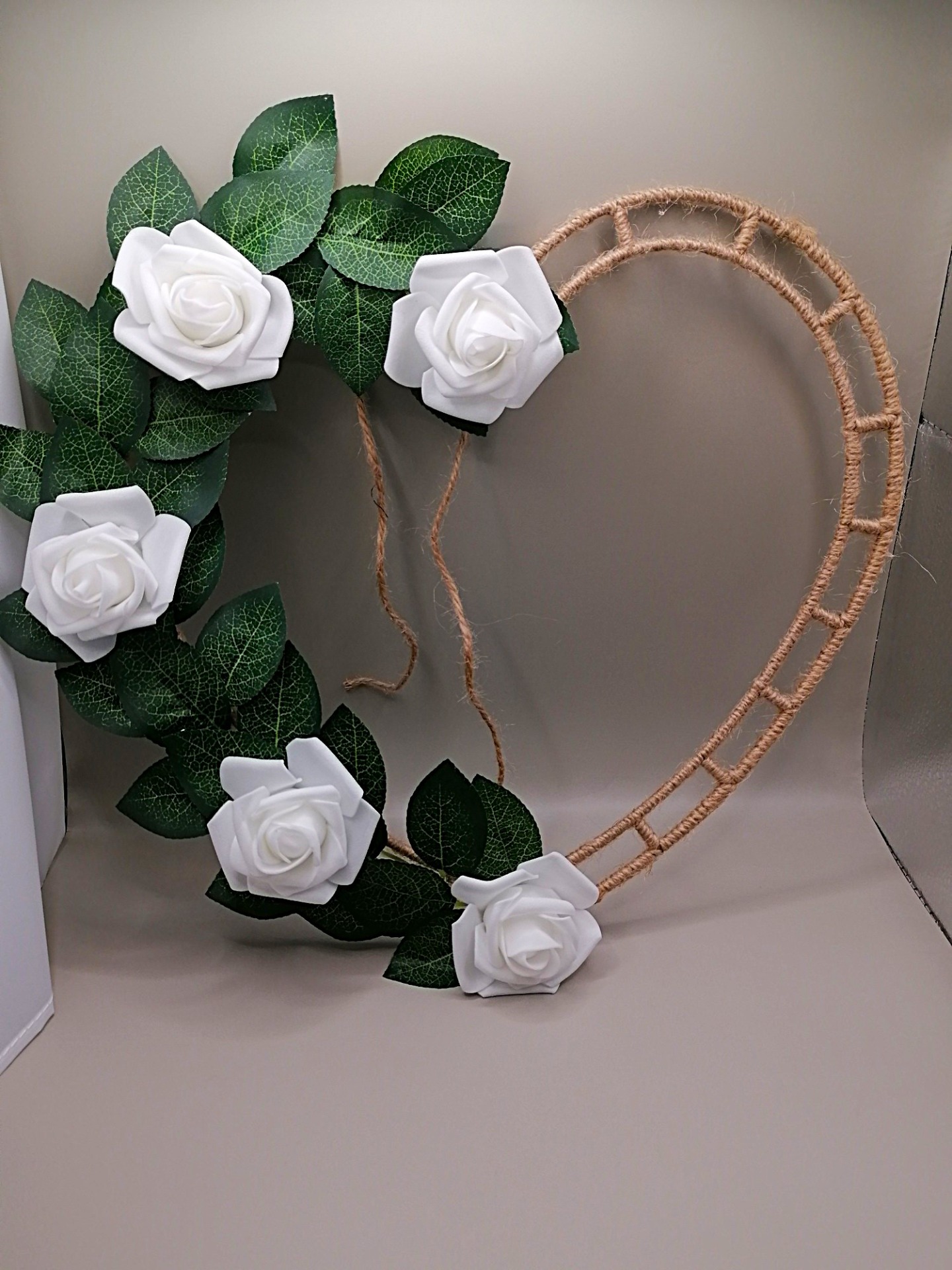 Ručně vyrobené srdce z pěnových růží v krásné bílé barvě s umělými listy a jurtou.Pěnové růžičky i listy jsou přilepené - je tedy bitelné. Provázek z druhé strany umožňuje zavěšení například na zeď.Velikost: 30 cmSvětýlka: NE